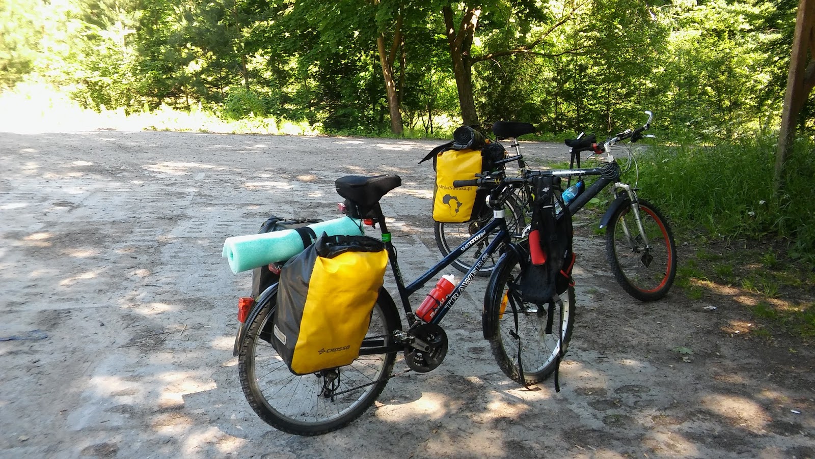 Ponieważ to była moja pierwsza wyprawa rowerowa, nie chciałam zaopatrywać się w sakwy, by potem kisić je bez sensu na naszych wyanajmowanych dwudziestu ośmiu metrach kwadratowych (minimalizm na zawsze). Udało się je pożyczyć (dzięki, Miłosz i Maciek!) i nawet nie za bardzo zniszczyć, a dodatkowo z dumą podróżowaliśmy z logo niesamowitej sztafety Afryka Nowaka (czek dys ałt!).