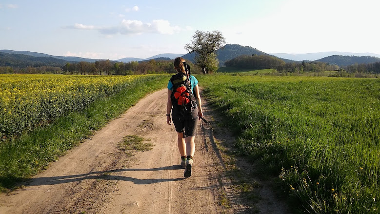 Schodzimy ze Skopca przez fantastyczne łąki. Z jednej podrywa się nakrapiane sarniątko i gna w stronę lasu. Otwierają się szeroko widoki, mijamy przeszkody do krossa usadowione na szczycie góry, a potem nas mija troje jeźdźców. Pewnie jadą tam skakać! – zachwyca się K., ale idziemy dalej, schodząc niżej i niżej. Łany rzepaku. Wodospady kwiecia. Wąchamy przepiękny purpurowy krzak wylewający się zza płotu, ja robię zdjęcia niemal wszystkim jabłoniom. Napotykamy komiczny przystanek z wsadzoną do środka wygodną kanapą. K. zanosi się ze śmiechu, tarzając po meblu, a ja sprawdzam rozkład jazdy. Jeden bus rano, drugi wieczorem. Rzeczywiście warto mieć na czym siedzieć, czekając. Wychodzimy na prostą drogę aż po horyzont, rozdzielającą morze rzepaku. Przed nami piękne, samotne drzewo na tle Sokolika i Krzyżnej. Jak z bajki! Słońce schodzi coraz niżej, oświetlając nam scenę polowania przez lisa na niewidocznego gryzonia, Animal Planet na żywo. W końcu między miękkimi krągłościami łąk docieramy do Trzcińska, gdzie się rozdzielamy, bo K. chce iść w górę niebieskim szlakiem, którym jeszcze nie szła. Leniwy Jogin nie daje się namówić i noga za nogą, robiąc zdjęcia, rusza do góry żółtym.